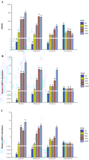 The expression levels of HMGCS2 (A) based on FPKM, (B) normalized using the 3 most stable CRGs (RPS15, MRPL39 and RPS23), and (C) normalized using the 3 least stable CRGs (RPS9, UXT and YWHAZ). The values are means ± SE. Each histogram is divided into four groups (rumen, reticulum, omasum and abomasum). Within each group, the developmental stages with different superscripts indicate significant differences (p < 0.05) in HMGCS2 expression between them. (For example, d is significantly lower than a, b and c).