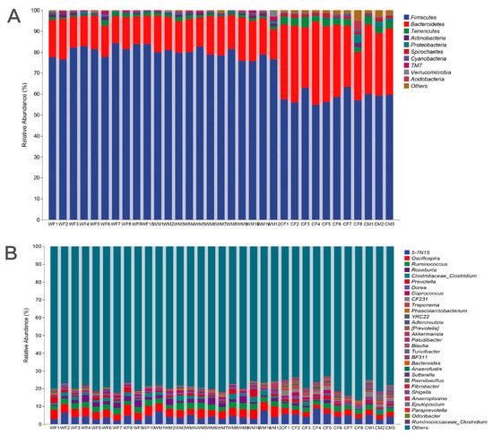 Relative abundance of the top 10 bacterial phyla and top 30 genera present in the fecal microbiota of wild and captive red deer (A) at the phylum level and (B) at the genus level (WF: n = 10, WM: n = 12, CF: n = 8, CM: n = 3).