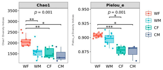 Boxplots of alpha-diversity indices showing differences between sex and environment (WF: wild female; WM: wild male; CF: captivity female; CM: captivity male). * represents significant (p < 0.05), ** represents very significant (p < 0.01), *** and represents highly significant (p < 0.001) (WF: n = 10, WM: n = 12, CF: n = 8, CM: n = 3).