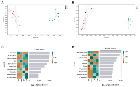Faecal microbial structure of red deer. (A) Principal Coordinate Analysis based on weighted unifrac showing microbial samples clustered by sex and environment into different groups (in parenthesis, the explained variance of each axis; WF: wild female; WM: wild male; CF: captivity female; CM: captivity male). (B) Principal Coordinate Analysis based on unweighted unifrac showing microbial samples clustered by sex and environment into different groups (in parenthesis, the explained variance of each axis; WF: wild female; WM: wild male; CF: captivity female; CM: captivity male). (C) A random forest heatmap indicating intergroup differences at the phylum level. Importance means screening the most critical phylum or genus that leads to microbial structural differences between groups (WF, WM, CF, CM). (D) A random forest heatmap indicating intergroup differences at the genus level (WF: n = 10, WM: n = 12, CF: n = 8, CM: n = 3).