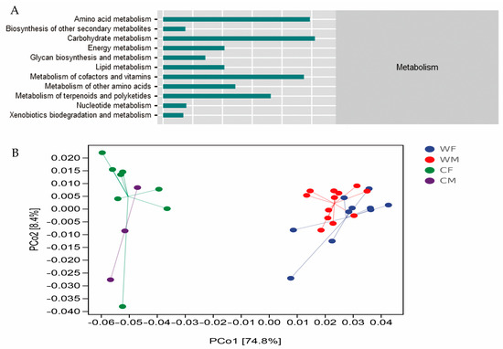 (A) Metabolic composition of secondary function pathways. (B) A PCoA plot based on weighted UniFrac distance metrics associated with a functional dataset. The colors represent sample sets of microbial functions (WF: n = 10, WM: n = 12, CF: n = 8, CM: n = 3).