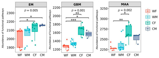 Microbial functions related to energy metabolism (EM), glycan biosynthesis and metabolism (GBM), and metabolism of other amino acids (MAA) grouped by sex and environment (WF: wild female; WM: wild male; CF: captivity female; CM: captivity male). * represents significant (p < 0.05), ** represents very significant (p < 0.01), and *** represents highly significant (p < 0.001) (WF: n = 10, WM: n = 12, CF: n = 8, CM: n = 3).