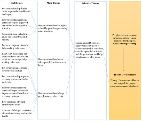 Interview transcripts were subjected to a thematic analysis using an inductive approach. All interviews were transcribed in full, using the transcription tool provided by Microsoft Word. The interview audio was subsequently reviewed manually to correct any mistakes to the transcription. To analyze the interview transcripts, the data were coded using the computer-assisted qualitative data analysis software NVivo (released in March 2020) [56]. The coding process was treated as a non-linear system and re-reviewed frequently to ensure that the interpretation privileged the perspectives of the respondents. The transcripts were manually assessed, line by line [57]. Using NVivo, codes (subthemes) were created by attaching annotations, concepts, and thematic domains to specific words and excerpts from the interview transcript [57]. Subsequently, relationships were identified between the created codes (subthemes), and these relationships were used to aggregate closely interrelated codes (subthemes) to develop major codes (themes). Afterwards, major codes (themes) were selected and integrated into meaningful summaries that address key components of the role of the human–animal bond for people in crisis situations. This complete non-linear coding process is depicted in Figure 1. Themes were then reviewed to determine whether they were distinct to the clients from a particular program (e.g., Homelessness) or a specific pet species, and addressed accordingly. Major codes and summaries were then organized to build a comprehensive report of theories that address the role of the human–animal bond for people experiencing crisis situations, as depicted in Figure 2.
