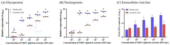 - Amtmann, A.; Ahmed, I.; Zahner-Rimmel, P.; Mletzko, A.; Jordan, L.K.; Oberle, M.; Wedekind, H.; Christian, J.; Bergmann, S.M.; Becker, A.M. Virucidal effects of various agents—Including protease—Against koi herpesvirsus and viral haemorrhagic septicaemia virus. J. Fish Dis. 2020, 43, 185–195. [Google Scholar] [CrossRef] [PubMed]