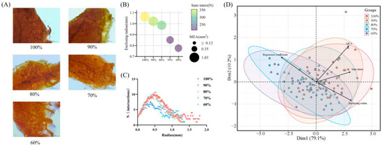 The mammary whole-mount images are shown in Figure 3A. For the enclosing radius, a significant increase was observed in the control group compared to the 70% and 60% groups (p < 0.05), while a significant increase was observed in the 90% group compared to the 60% group (p < 0.05; Table 2). MEA did not differ in the control, 90% and 80% groups (p < 0.05), while it was significantly lower in the 70% and 60% groups than in the former three groups (p < 0.05; Table 2). Sum inters were significantly higher in the control, 90% and 80% groups than in the other two groups (p < 0.05; Table 2). The k of 70% and 60% were significantly higher than the other three groups (p < 0.05; Table 2). Branching density was not significantly different among the groups (p > 0.05; Table 2). Consistent with the results in Table 2, an identifiable change in mammary gland development was observed from the 80% group to the 70% group in Figure 3B. Figure 3C shows the number of intersections of each concentric circle with the mammary ducts in the Sholl analysis. The control group had the longest duct extension distance. At a radius of 0.5 mm, the control, 90% and 80% groups reached the highest number of intersections with a similar peak, all higher than the 70% and 60% groups.