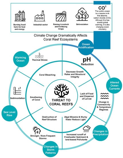 Anthropogenic pressures on reefs have been the dominant factor damaging coral reefs through a range of stresses (Figure 1). Unsustainable land-based human activities, such as deforestation, poorly regulated agriculture, and urban/industrial development, are major contributors to the release of excessive sediments and nutrients into the environment [26,27,28]. Increases in human-caused greenhouse gas emissions are the primary factor in the current climatic shift around the world [29,30]. The ocean acts as a massive sink that absorbs carbon dioxide, resulting in the acidification of the oceans [31,32]. Coral bleaching and widespread damage to the coral reef ecosystem have become increasingly common because of thermal stress brought on by rising ocean temperatures [33]. Lack of food to sustain the coral reef ecosystem and disruption of larvae dispersal are both attributable to altered currents, upwelling, and/or vertical mixing brought on by changing currents and winds [34]. Storms and cyclones are “agents of mortality” on coral reefs and can have a direct impact on the structure and local distribution of coral reef assemblages, especially through the large waves they produce [35]. Reduced salinity caused by heavy rainfall and enhanced surface run-off onto nearshore reefs during cyclones, storms, and heavy precipitation rates can lead to algal blooms and other devastating results [36,37]. The rise in sea level, caused by thermal expansion and the melting of ice on land, has varied across different regions of the world over the past century, with an average increase of approximately 20 cm [38]. The sedimentary mechanisms triggered by the rising sea levels have the potential to intensify and jeopardize crucial physiological reef processes, such as photosynthesis, feeding, and recruitment, thereby posing a severe threat to coral reefs and related ecosystems, such as seagrass meadows and mangrove forests [39,40]. This threat, coupled with increasing carbon dioxide (CO2) emissions, can negatively impact these vital ecosystems. Without effective local measures and a concerted effort to reduce carbon dioxide emissions, these effects are projected to intensify, leading to an unprecedented degradation of marine biodiversity and ecological balance [41,42].