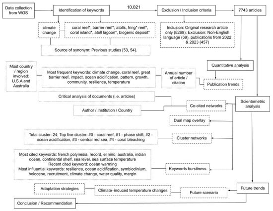 This review addresses the question, “How have coral reefs been affected by climate change and their interactions using bibliometrics?”. Specific objectives were to assess the literature in terms of (i) the annual number of articles published, (ii) countries/regions involved in the field, (iii) research topics, (iv) cocited networks (i.e., frequency of two different documents are cited together in other documents), (v) cluster networks, (vi) research topic (i.e., keywords) burstiness, (vii) dual map overlay, and (viii) the future trends of the knowledge domain (i.e., coral reef and climate change). The main article structure diagram is shared in Figure 2.