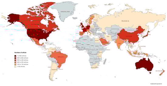 The coral reef and climate change field showed an increase in published articles, indicating that the research is in rising momentum (Figure 3). Since 2006, studies on coral reef and climate change have been published, amounting to approximately 1.5% to almost 10% of total articles on the WoS platform in 2021, especially in the WoS Core Collection (WOSCC) database. The field entered an accelerated uptrend phase in 2016, and it is anticipated that this phase will last for the next 5 to 10 years for research publications and citations. This could be because the WOSCC added a new edition of the Emerging Sources Citation Index (ESCI) database in 2015 [55]. The leading countries in coral reef and climate change research are shown in Figure 4. The USA and Australia produced the most publications, with 2940 and 2933 articles, respectively, more than triple the output of third-ranked England, with approximately 719 articles. The USA and Australia contributed more than 75% of all publications. The study also found that there is a lack of studies conducted in the African regions. As expected, countries without coastal areas, such as Kazakhstan and Mongolia, showed no articles published in the coral reef and climate change fields. Additionally, most island nations, such as Japan, New Zealand, Australia, or Cuba, contributed to the knowledge of the coral reef and climate change.