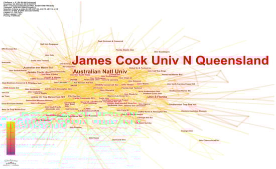Ellegard and Wallin [46] opined that the distribution of research institutions is a useful indicator of academic support for a discipline. The network of institutions generated 948 nodes (i.e., group of entities) and 2666 collaborative links among institutions conducting research (Figure 4). The 4159 documented affiliations reflect the importance of this field in academia and the intensity of the investigations. Institutions in this collaborative network (a collaborative affiliation appeared in the article) that have contributed the most to this field are shown in Figure 5 and Table 1. An analysis of 7743 publications related to coral reefs and climate change identified a total of 29,890 affiliations. The top 20 institutions contributed to 7231 affiliations, which accounted for nearly 24% of all publications. Specifically, James Cook University was found to have contributed the highest number of publications (1119, 14% of the total), followed by the Australian Institute of Marine Science and the University of Queensland. These findings suggest that a small number of institutions have played a significant role in the research on the impact of climate change on coral reefs.
