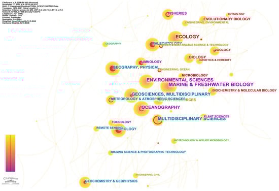 CiteSpace’s “Category” node type was used to generate a visual map showing research disciplinary categories represented by papers addressing issues related to climate change’s impact on coral reefs. The centrality of a network (i.e., the center of collaborative activities) comprising 135 nodes and 336 links was computed after the data were simplified and merged (i.e., automatically generated from the CiteSpace algorithm and programming) (Figure 6). The five disciplines with the most publications in descending order were marine and freshwater biology, environmental sciences, ecology, oceanography, and geosciences. The study of coral reefs is a multifaceted research topic that includes many fields of study, as demonstrated by the distribution map. Disciplines in related subjects such as biodiversity conservation, geography, physical sciences, biology, evolutionary biology, geology, paleontology, and water resources, show strong connections, represented by the sizes of the nodes. The number of published papers is comparably low in some research disciplines, such as toxicology, biotechnology and applied microbiology, green and sustainable science and technology, and biochemistry and molecular biology. However, the relatively high betweenness centrality values of these fields suggest their significant contribution to interdisciplinary research, signifying their pivotal position in the scientific network. This centrality may also hint at their potential for future development and advancement in the field.