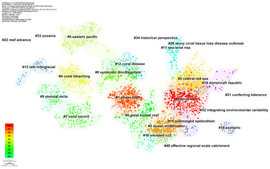Cluster analysis is a popular method of statistical data analysis and knowledge discovery because of its ability to uncover latent semantic themes in textual data [93,94]. Cluster analysis can divide a large body of research data into various units based on the relative degree of term correlation, making it easier to identify the research themes, trends, and connections within a given field of study [94,95]. A cluster’s homogeneity can be quantified using an index called the mean silhouette, with values ranging from −1 to 1. The average silhouette value for each cluster was determined using CiteSpace. The higher the value, the more similar the cluster’s members are to one another [96]. The network showed 24 clusters in the context of the scientometric analysis mapping the link between climate change and coral reefs (Figure 7).