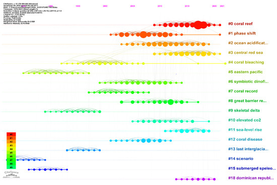 The timeline for the document co-citation analysis is an important indicator to explain the period when the study got the attention of the researcher worldwide (Figure 8). From 2010 to 2021, there have been bursts in citations for research clusters on (#0) “coral reefs”, (#2) “ocean acidification”, (#3) “central sea”, (#11) “sea level rise”, and (#5) “eastern pacific”. When taken as a whole, these studies shed light on the growing interest in studying the effects of ocean acidification and sea level rise on coral reefs, with particular attention paid to the plight of these ecosystems within the eastern pacific area, such as in the central Red Sea and the Dominican Republic.