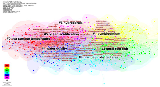 Using the co-cited keyword analysis performed in CiteSpace, 963 unique keywords were generated. In order to better understand the connections between these terms, a clustering tool was used to categorize them into groups (Figure 9). This generated seven major clusters consisting of “sea surface temperature”, “Symbiodinium”, “coral reef fish”, “marine protected area”, “water quality”, “ocean acidification”, and “hydrocorals”. Each of these clusters can be analyzed independently to determine which descriptors are most applicable. The major keywords used to discuss “sea surface temperature”—record, Indian ocean, and reef; “Symbiodinium”—scleractinian coral, diversity, zooxanthellae, population, nutrient enrichment, elevated pressure, and oxidative stress; “coral reef fish”—phase shift, ecosystem, disturbance, fish, dynamics, community, recruitment, abundance, thermal tolerance, Stylophora pistillata, and ecology; “marine protected area”—management, assemblage, biodiversity, susceptibility, degradation, adaptation, response, and recovery; “water quality”—sea level, Great barrier reef, rate, transport, coral bleaching, French Polynesia, and fringing reef; “ocean acidification”—climate, El Niño, impact temperature, coral reef, calcification, and carbon; and “hydrocorals”—seawater and carbon dioxide.