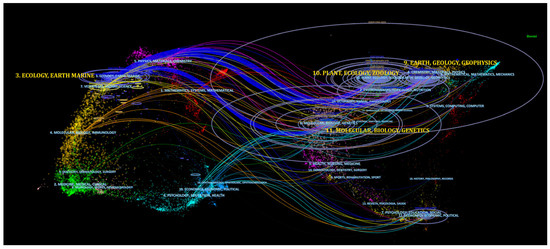 Figure 10 illustrates the dual-map overlay of the number of articles pertaining to the type or focus of the journal. The map labels represent the research subjects covered by the journals, with the citing journals displayed on the left side and the cited journals on the right. The trajectory of the citation links provides valuable insights into inter-specialty relationships. A shift in trajectory from one region to another would indicate the influence of articles from another discipline on a specific field. In the domain of coral reef and climate change interaction, the dominant fields were found to be “ecology, earth, and marine”. The most influential discipline was “plant, ecology, and zoology”, with a z-score of 7.66, followed by “earth, geology, and geophysics”, with a z-score of 4.99 and, lastly, “molecular, biology, and genetics”, with a z-score of 2.80. These findings provide a valuable understanding of the interdisciplinary relationships within the field of coral reef and climate change research, highlighting the influence of various disciplines in shaping the current research landscape.