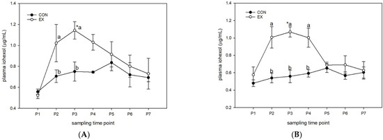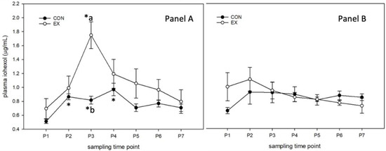 Day 0 vs. Day 28: In SED horses, plasma iohexol was significantly higher on Day 0 than on Day 28 at P3 and P5 (p = 0.04 and 0.05, respectively). There were no significant differences between Day 0 and Day 28 in EX horses (p = 0.23) (Figure 1).