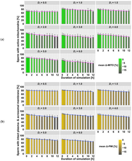 Summary of flow cytometric measurements (n = 336 samples) on day 4 after treatment: (a) mitochondrial activity (MITO); (b) plasma membrane and acrosome integrity (PMI). Mean absolute values, grouped by intensity (Di) and duration (h) of vibration treatment, are shown as bars with standard deviation (SD) as the error bar. The color of the bars represents the mean difference (Δ) to the control group (duration = 0 h). The colored line shows the values of the applied regression model.