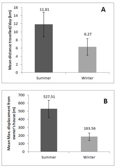 | Kays et al. [3] (owned) | Australia, New Zealand, USA, UK, Denmark | 5 to 20 days (not reported) | 2.5 ± 3.9 (Australia) 4.3 ± 6.8 (New Zealand) 4.6 ± 7.3 (UK) 4.7 ± 6.5 (USA) 3.6 ± 5.6 Overall mean | Not reported |