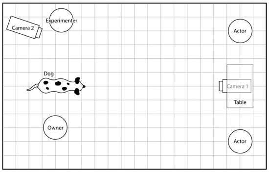 Dogs were habituated to the environment before testing, which lasted between five and ten minutes. After this, the owner and the dog went to a separate area while the actors entered the experimental room and positioned themselves in front of the chairs. A helper also entered the room, put the food (dried meat treats) in the bowls and started the cameras. The owner and the dog were instructed then to return to the experimental room. Upon entering the experimental room, the owner was asked to go with the dog to the table and, ignoring the actors, present the two bowls to the dog until it showed interest. After the dog had seen and smelled the food, they returned the bowls to the table. The dogs did not get an opportunity to eat the food at this point. After that, both went to their designated marking at the other end of the room, as shown in the figure below, and stood there until the owner was given the command to release the dog from the leash. From that point on, nobody interacted with or responded to the dog in any way (see [18] for more details).