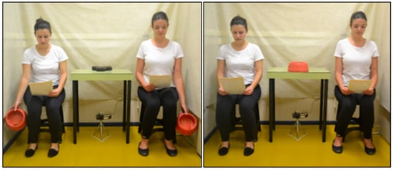 The experiment consisted of two phases. First, the observation phase, in which the dogs were presented with a social interaction between the two unfamiliar humans (actors). The actors were two Caucasian females of the same age trained beforehand. During all tests, they wore the same clothes, had their hair wrapped in the same way, wore no makeup, jewellery or perfume. In the interaction, the actors had a giver–receiver dynamic with the three black discs. At the start, both were quiet, still and neutral in facial and body expressions, standing beside the table with the two bowls with food and the three discs. One of the actors would then pick up a disc, always displaying an emotionally neutral facial expression, and deliver it to the other actor, who, upon receiving it, would turn their head and express either a positive (happiness), negative (anger) or neutral facial expression (Figure 2) and then return the disc to the table. This process happened three times, each with different discs in order to make sure the dog had a chance to observe the exchange for at least 5 s. The two actors would then pick up a piece of paper and sit on their respective chairs looking down and remaining with neutral facial and body expressions (see video S1). The owner then received a cue to release the dog from the leash and, upon doing so, the dog was free for 30 s to explore the environment and interact with its elements (Videos S2 and S3). There were two possible scenarios for accessing food: in the direct condition, each actor held a bowl with one hand, giving direct access to the dog to reach it; in the indirect condition, both bowls were on the table (Figure 3), so the dog would need to interact with one of the demonstrators to access either bowl. Which actor gave and received the discs, the facial expression displayed and the availability of the bowls was randomised between subjects. Both phases were recorded with two cameras, and images of the response phase were put together side by side to make one single file that enabled coding from both angles.
