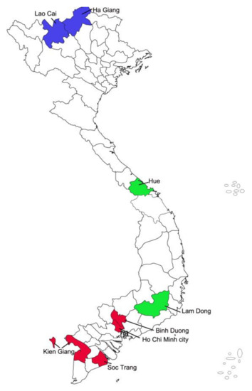 Sampling sites. SVN (red): 310 samples (Kien Giang: 223, Soc Trang: 21, Binh Duong: 7, Ho Chi Minh city: 59); CVN (green) 41 samples (Lam Dong: 26, Hue: 15); NVN (blue): 46 samples (Lao Cai: 15, Ha Giang: 31).