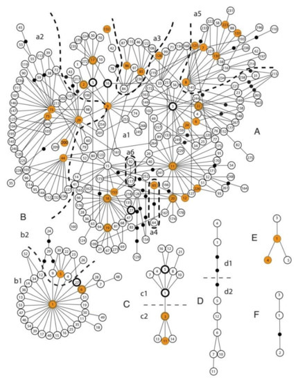 Minimum spanning networks showing Vietnam village dog haplotypes (yellow-filled circles) in the worldwide dog haplotypes (blank circles). The haplogroups A, B, C, D, E, and F are represented by the letters A, B, C, D, E, and F, respectively.