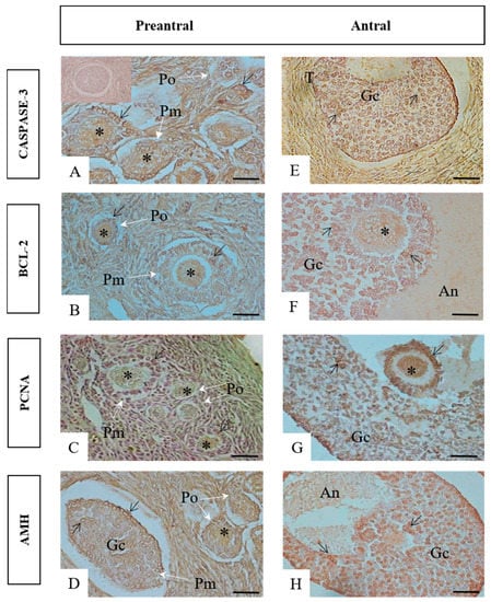 The immunoreactive pattern observed for cleaved Caspase-3, BCL-2, PCNA, and AMH was similar in the two species studied. Immunostaining for cleaved Caspase-3 was observed in oocytes and some granulosa cells of the preantral follicles (Figure 1A); it was also observed in the oocytes, granulosa cells, and in the internal and external theca of the antral follicles (Figure 1E). Strong immunostaining for BCL-2 and PCNA was observed in the oocytes and granulosa cells of the preantral and antral follicles (BCL-2: Figure 1B,F; PCNA: Figure 1C,G). Immunostaining for AMH was observed in granulosa cells of the preantral follicles (Figure 1D), and in oocytes and granulosa cells of the antral follicles (Figure 1H).