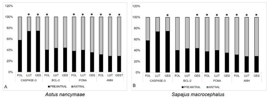 Percentage of follicles (preantral and antral) immunostained for Caspase-3, BCL-2, PCNA, and AMH, according to the sexual phases (FOL—follicular, LUT—luteal and GES—gestational). (A) Ma’s night monkeys (Aotus nancymae, n = 6) and (B) head-large capuchins (Sapajus macrocephalus, n = 6). (*) indicate that there is a statistically significant difference between preantral and antral follicles, according to the stage (Binomial Test. p < 0.01).