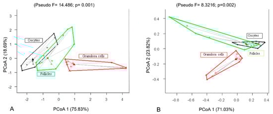 A principal coordinate analysis (PCoA) was used to evaluate the relationship between the indicators of granulosa cells, follicles, and oocytes with positive staining for Caspase-3, BCL-2, PCNA, and AMH, while considering the sexual phases to elucidate the action of these proteins in the ovaries []. A permutational multivariate analysis of variance (PERMANOVA) was applied to assess the significance of the variation observed in this quantification []. The homogeneity of the dispersion and the difference between groups was determined by permutational analysis of multivariate dispersion (PERMDISP) []. All statistical analyses were performed using BioEstat 5.0 software (IDSM, MCT, CNPq, Belém, Pará, Brazil) and R Software (R Development Core Team, 2016).