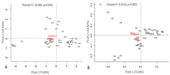 Immunohistochemical variables (Caspase-3, BCL-2, PCNA, and AMH), sorted by the principal coordinate analysis (PCoA) according to follicular types. (A) Ma’s night monkeys (Aotus nancymae, n = 6) and (B) head-large capuchins (Sapajus macrocephalus, n = 6). O: Oocytes; F: Follicles: G: Granulosa cells.