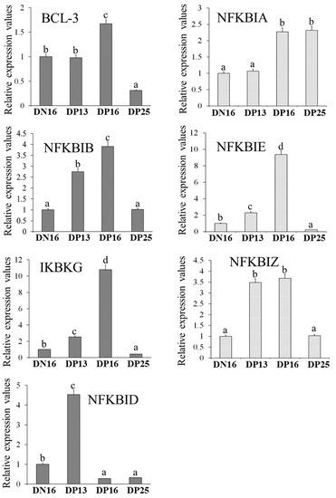 Figure 1 revealed that compared to NP16 and DP13, the relative expression level of BCL-3 mRNA was increased at DP16, but decreased significantly at DP25 (p < 0.05). The relative expression level of NFKBIA mRNA was upregulated at DP16 and DP25 compared toNP16 and DP13 (p < 0.05). Furthermore, there was an increase in the relative expression levels of NFKBIE and IKBKG mRNA from DP13 and DP16 compared to NP16, but the levels were downregulated significantly at DP25 (p < 0.05). In addition, NFKBIB and NFKBIZ mRNA levels were higher at DP13 and 16 compared to NP16 and DP25 (p < 0.05). On the other hand, there was a peak in the relative expression level of NFKBID mRNA at DP13, but the level of NFKBID was lower at DP16 and DP25 compared to NP16 (p < 0.05).
