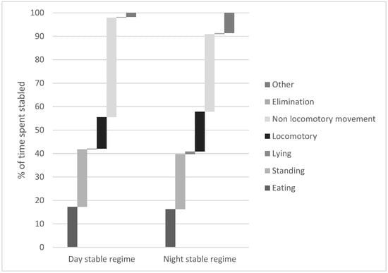 Horses kept in the stables overnight were housed for a significantly longer period (13.60 ± 0.04 h) than horses kept in stables during the day (7.73 ± 0.07 h; t7 = 5.70; p = 0.0004) and displayed significantly more total behaviours on average per hour of stabling (t7 = 2.70; p = 0.03).