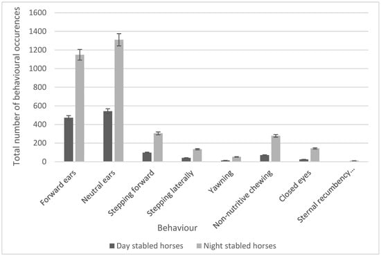 A series of unpaired t-tests were also used to compare the frequencies of behaviours occurring with stabling routines, and 11 behaviours were found to have a significant difference. This was reduced to eight after the Holm–Bonferroni correction was applied. No horses demonstrated stereotypical behaviours such as windsucking, weaving, or box walking, whilst all horses demonstrated a positive approach when humans entered the stable. Significant increases in the frequency of ear movements (forward ears, t7 = 3.32, p = 0.001; neutral ears, t7 = 3.47, p = 0.001; locomotory behaviours (stepping forward, t7 = 2.62, p = 0.001; stepping laterally, t7 = 2.40, p = 0.001); and behaviours classified as ‘Other’ (yawning, t7 = 2.70, p = 0.001; non-nutritive chewing, t7 = 2.49, p = 0.001) were seen in night-stabled horses. Other behaviours that showed significant increases for night-stabled horses were closing of the eyes (t7 = 2.69; p = 0.001) and sternal recumbency (facing sideways, t7 = 2.640; p = 0.001). Significant behaviours and the number of occurrences were compared using a bar chart (Figure 2).