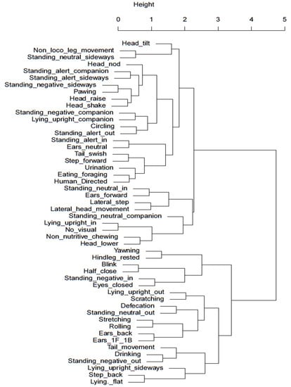 Cluster dendrogram of day-stabled horses. Behaviours with smaller heights in shared clades demonstrate the highest level of correlation. A greater distance between clades and increasing height of the y-axis indicate a weaker relationship.