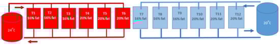 Two hundred and four juvenile seabasses (16.8 ± 0.6 cm; 59.6 ± 3.6 g) were randomly distributed in 12 fiber-glass tanks of 200 L each (n = 3 tanks/treatment; 17 individuals/tank), in a factorial design manipulating temperature [ambient temperature (20 °C) (average summer sea surface temperature for the Portuguese coast) and warming (24 °C—the future sea surface temperature warming scenario in 2100 (+4 °C) [22] and two diets (16% and 20% lipid) for 56 days (Figure 1), in tanks with a mechanical filter, biofilter, skimmer, UV filter, and aeration system, and were maintained in a constant photoperiod (14 L: 10 D). Fish were fed twice a day until satiety. Tanks were monitored daily for O2 (7.5 ± 0.3 mg L−1), pH (7.2 ± 0.17), salinity (35.5 ± 0.7 ppt), ammonia (0.4 ± 0.19 mg/L), and nitrites (0.79 ± 0.41 mg/L). The temperature was kept according to the experimental design at 20.2 ± 0.19 °C and 23.9 ± 0.03 °C.