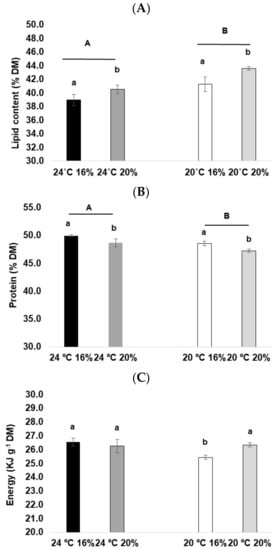 Energy content seems to be lower at lower temperatures and in diets with lower lipid content. Temperature has a crucial effect on the physiology of animals. As a result of global warming, increasing temperatures can affect fish populations by decreasing their performance when temperatures rise above an optimal range of values, which can lead to a greater consumption of energy [44]. In the present study, it seems that 24 °C is a more adequate temperature for sea bass, allowing it to store more energy than at 20 °C with a 16% lipid diet. On the other hand, the dietary lipid level had no effect on body energy storage.