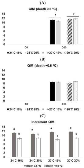 QIM values for D. labrax along with 10 days in ice. (A) fish sacrificed at 0.6 °C; (B) fish sacrificed at −0.6 °C; (C) increment of QIM from D0 to D10 at both death conditions. The values represent the mean ± SE. Different letters (a,b) represent statistical differences among treatments.