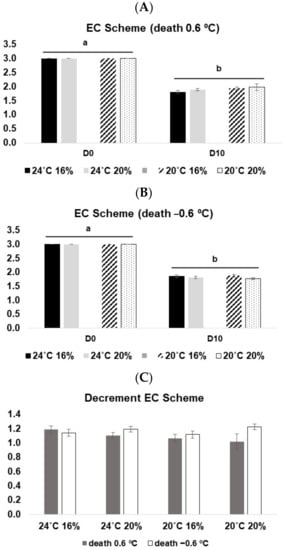 EC scheme values for D. labrax along with 10 days in ice. (A) fish sacrificed at 0.6 °C; (B) fish sacrificed at −0.6 °C; (C) decrement of the EC scheme from D0 to D10 at both death conditions. The values represent the mean ± SE. Different letters represent statistical differences among treatments.