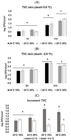 TVC values for D. labrax along with 10 days in ice. (A) fish sacrificed at 0.6 °C; (B) fish sacrificed at −0.6 °C; and (C) an increment of TVC from D0 to D10 at both death conditions. The values represent the mean ± SE. Different letters represent statistical differences among treatments.