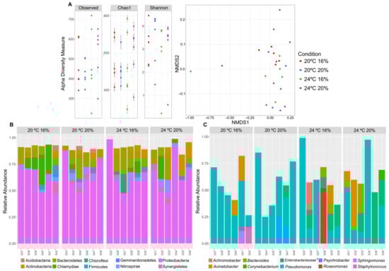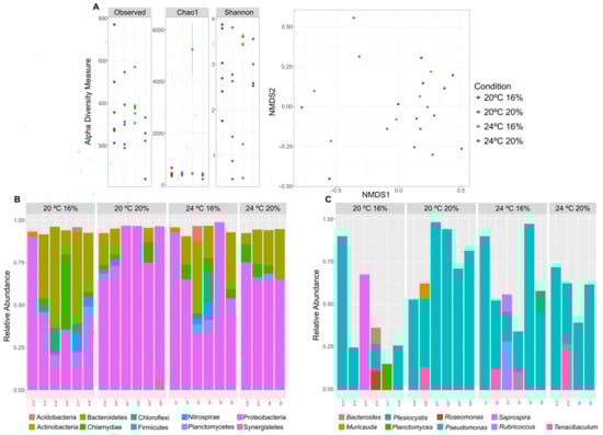 Skin swabs of fish sacrificed at 0.6 °C, at D0 and D10, were selected for microbiome analysis through high-throughput sequencing of 16S rRNA amplicons. Taxonomic profiling at D0 revealed that the skin microbiome of all fish presented similar diversity and richness, regardless of rearing and dietary conditions (Figure 7A). Proteobacteria and Bacteroidetes phyla dominated the skin microbiome of D. labrax, though the latter phylum was found particularly abundant in fish reared at 20 °C and with a 16% lipid diet (Figure 7B). At the genus level, Pseudomonas was the dominant phylotype across all samples, in some cases accounting for over 90% of representation in the bacterial communities (Figure 7C). Some exceptions to this were noted in fish reared at 20 °C and fed 16% lipid, where an unusual prevalence of Saprospira (S15) and Planctomyces (S17) were observed in some samples (Figure 7C). In addition, Tenacibaculum bacteria were found to have an important representation alongside Pseudomonas in fish reared at 24 °C (Figure 7C).