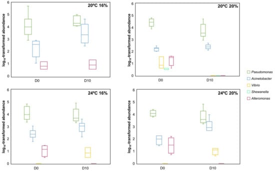 For the generated 16S rRNA amplicon sequencing datasets, bioinformatics analyses were performed using the QIIME pipeline [32] and the phyloseq package in the R environment (v.3.6.1) [33], as described elsewhere [30]. To track the emergence of potential fish-spoiling bacteria during the 10-day ice storage period, the abundances (as read counts) of bacterial genera mostly known to accommodate such microorganisms, namely Pseudomonas, Acinetobacter, Vibrio, Shewanella, and Alteromonas [34,35,36,37], were log10-transformed for a direct comparison of their prevalence and distribution between D0 and D10.