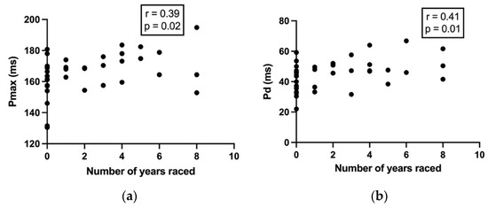 In a subset of 38 horses that excluded the 15 retired horses that had previously raced, significant positive correlations with exercise duration (number of years raced) were identified for both Pmax (r = 0.39; p = 0.02) and Pd (r = 0.41; p = 0.01) but not Pmin (Figure 2a,b).