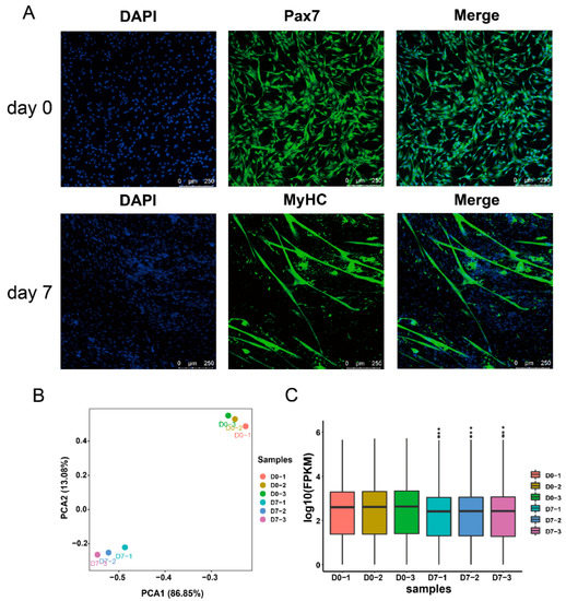 Ovine skeletal muscle satellite cell isolation and gene expression levels. (A) Immunofluorescent staining results at the proliferation and differentiation stages; (B) principal component analysis of six samples; (C) the expression level of mRNAs; FPKM represents the fragments per kilobase of transcript per million mapped reads.