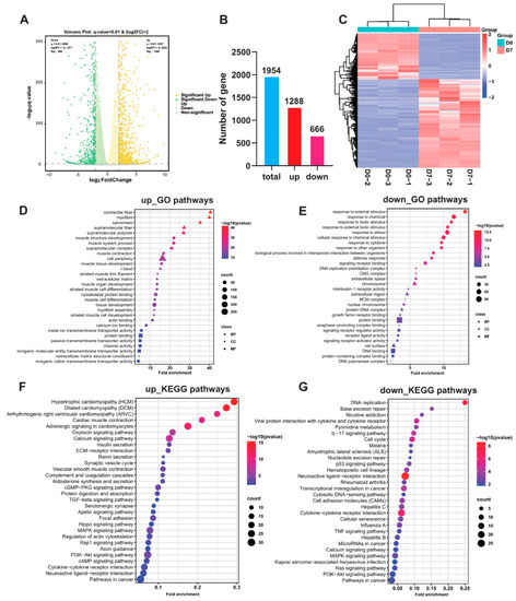 The expressions and functional analyses of the DEGs in SMSCs at the proliferation and differentiation stages. The schemes follow the same formatting. (A) The volcano plot of DEGs between groups D0 and D7 groups |Log2 fold change| > 2, q < 0.01; the q value was adjusted to the p value by multiple hypothesis testing. (B) The number of DEGs. (C) Heat maps showing DEGs were expressed between the D0 and D7 groups, red denotes a high level of expression, whereas blue denotes a low level of expression. (D) GO analysis showing the top 30 pathways of the upregulated DEGs. (E) GO analysis showing the top 30 pathways of the downregulated DEGs. (F) KEGG analysis showing the top 30 pathways of upregulated DEGs. (G) KEGG analysis showing the top 30 pathways of downregulated DEGs (p < 0.05). Note: The size of the circle indicates the number of annotated differentially expressed genes, and the color represents the −log p value.