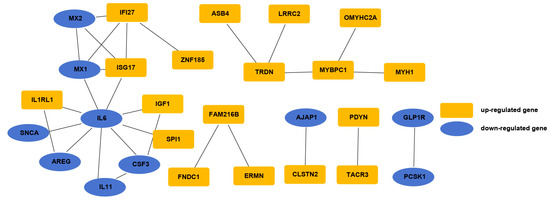 As shown in Figure 3, the PPI network based on the top 50 most upregulated DEGs and the top 50 most downregulated DEGs consisted of 28 nodes and 29 interaction pairs. The PPI network included eight interaction pairs for downregulated DEGs, 10 interaction pairs for upregulated DEGs, and 11 interaction pairs between the upregulated and downregulated DEGs. The results showed that IL6 correlated with nine other genes including IGF1, IL11, and AREG, and MYBPC1 correlated with three other genes including MYH1, which is involved in the proliferation and differentiation of SMSCs.