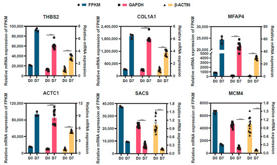 In order to determine the accuracy and validity of the RNA-Seq results, six differentially expressed genes (four upregulated and two downregulated genes) including THBS2, COL1A1, MFAP4, ACTC1, SACS, and MCM4 were detected using the RT-qPCR method. The GAPDH and ꞵ-ACTIN genes were used as the internal reference gene. Consistent with the RNA-Seq results, THBS2, COL1A1, MFAP4, and ACTC1 were upregulated at the differentiation stage, and SACS and MCM4 were downregulated at the differentiation stage (Figure 4).