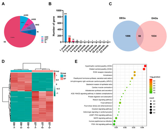 Differential splicing analysis of DEGs between the proliferation stage and differentiation stage of SMSCs. (A) Distribution of five AS events. SE: skipped exon, A3SS: alternative 3′ splice site, A5SS: alternative 5′ splice site, RI: retained intron, MXE: mutually exclusive exons. (B) Differential splicing events between proliferation stage and differentiation stage; (C) Venn diagram depicting DEGs and DAGs. (D) The heatmap of 58 overlapped genes, where red denotes a high level of expression, whereas green denotes a low level of expression; (E) KEGG pathways of the overlapping DEGs and DAGs, where the size of the circle indicates the number of annotated differentially expressed genes, and the color represents the −log p value.