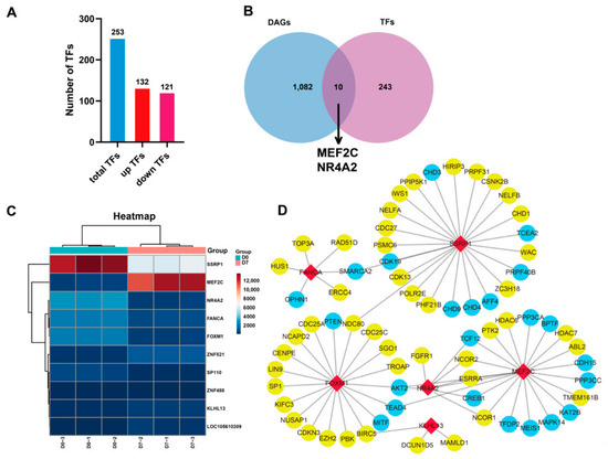 Transcription factor analysis of DEGs in SMSCs between the myoblasts and myotubes. (A) The number of TFs in upregulated and downregulated TFs (|log2 Fold Change| > 1). (B) Venn diagram of DAGs and TFs. (C) Heatmap of the nine transcription factors. (D) The protein–protein analysis of DAGs and TFs with differentially expressed genes split into two groups. Red, transcription factor; blue, upregulated genes; yellow, downregulated genes.