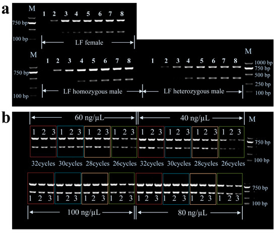The agarose gel electrophoretic bands of multiplex PCR optimization test. M represent DL2000 DNA Marker. (a) The multiplex PCR agarose gel electrophoretic bands of different Ta. 1–8 represent 69.9 °C, 68.7 °C, 67.0 °C, 65.0 °C, 63.3 °C, 62.1 °C, 61.2 °C, 60.6 °C, respectively. (b) The multiplex PCR agarose gel electrophoretic bands of different cycle numbers and DNA template concentration; 1, 2, and 3 represent LF homozygous males, LF heterozygous males, and LF females, respectively.