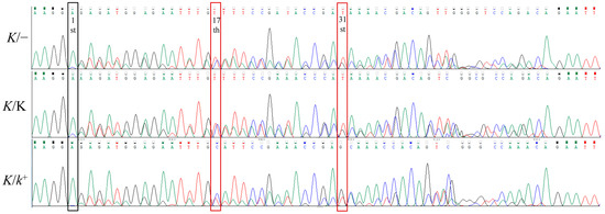 Sex identification of newly hatched chicks is an important part of the poultry industry, which directly affects production and economic value. Autosexing based on sex-linked phenotypic features (plumage color and pattern, feathering rate, etc.) can achieve nearly 100% sex identification accuracy [1]. Compared to a direct check of the presence or absence of rudimentary phallus in the ventral part of the cloaca to identify sex, autosexing can not only avoid injury to chicks but also be more convenient and accurate [2]. So, it was widely used by hatcheries. Sex-linked phenotypes of late feathering (LF) and early feathering (EF) are controlled by a pair of alleles of K and k+ in Chromosome Z. The distinction between EF and LF is based on the length of the primary feathers and primary-convert feathers at hatching, with primary feathers more than 2 mm longer than primary-convert feathers being EF, otherwise, they are considered as LF [3]. K allele is incompletely dominant to k+ and has a retard effect on the primary and secondary flight feathers growth [4,5,6,7]. When homozygous EF males (k+/k+) mate with LF (K/−) females, their progeny males are LF (K/k+), and females are EF (k+/−), thus achieving gender separation. For poultry breeders, the establishment of EF and LF pure-breeding strains is the key to autosexing. Pure-breeding EF strain can be selected directly in one generation based on phenotypes, while it takes at least two generations to establish a pure-breeding LF strain because the homozygote and heterozygote roosters are generally identified by test cross. Therefore, it is of great significance to the poultry industry to explore suitable molecular markers and effective methods to distinguish LF homozygote and heterozygote, which can not only avoid test cross but also save the economic and time costs of establishing Pure-breeding LF strain.