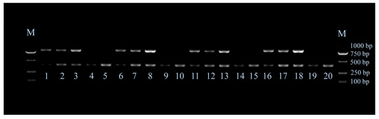 The balance of relative primer concentrations at the various loci, annealing Ta, DNA template concentration, and cycle number, among others, are critical for a successful multiplex PCR assay [25,31,32]. In this study, the two fragments share R primers, so the amount of R primers in each PCR system is twice that of F1 and F2 primers. By reaction optimization test, the multiplex PCR for genotyping was set with a Ta value of 61 °C, 26 cycles, and a DNA template concentration of 40–50 ng/µL. Below 26 cycles and 40 ng/uL due to the low concentration of the multiplex PCR product, the electrophoretic bands are less bright, which is not conducive to genotyping and may not meet the sequencing requirements when Sanger sequencing. Since the PCR instrument and Taq enzyme et al. can affect the multiple PCR amplification efficiency, the reaction conditions may be different from those in this study. Therefore, we recommend obtaining the optimal conditions by reaction optimization test. Otherwise, the accuracy of identification may be affected. The brightness of the electrophoretic bands is mainly related to the length and concentration of the product, so ensuring the total amount of DNA templates is basically equal in each reaction is the key to identification by electrophoretic bands. Based on electrophoretic bands, not only homozygote and heterozygote can be identified, but also male and female can be distinguished.